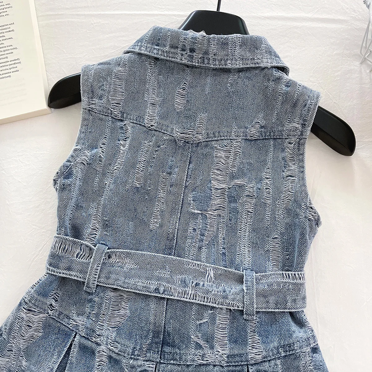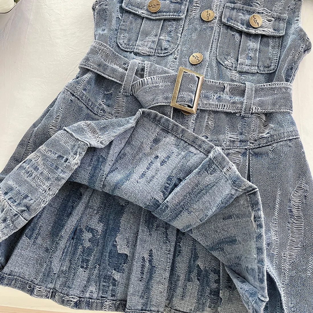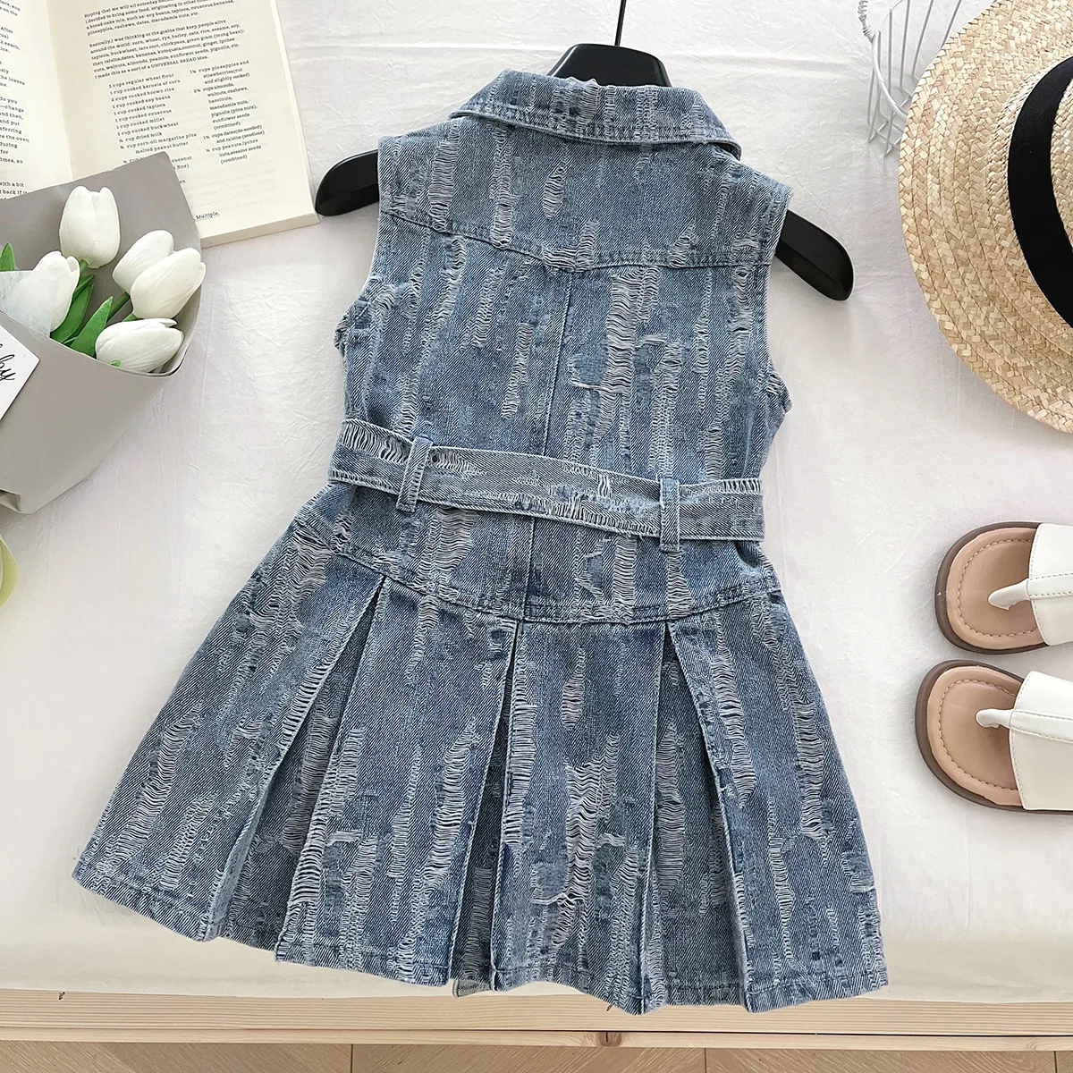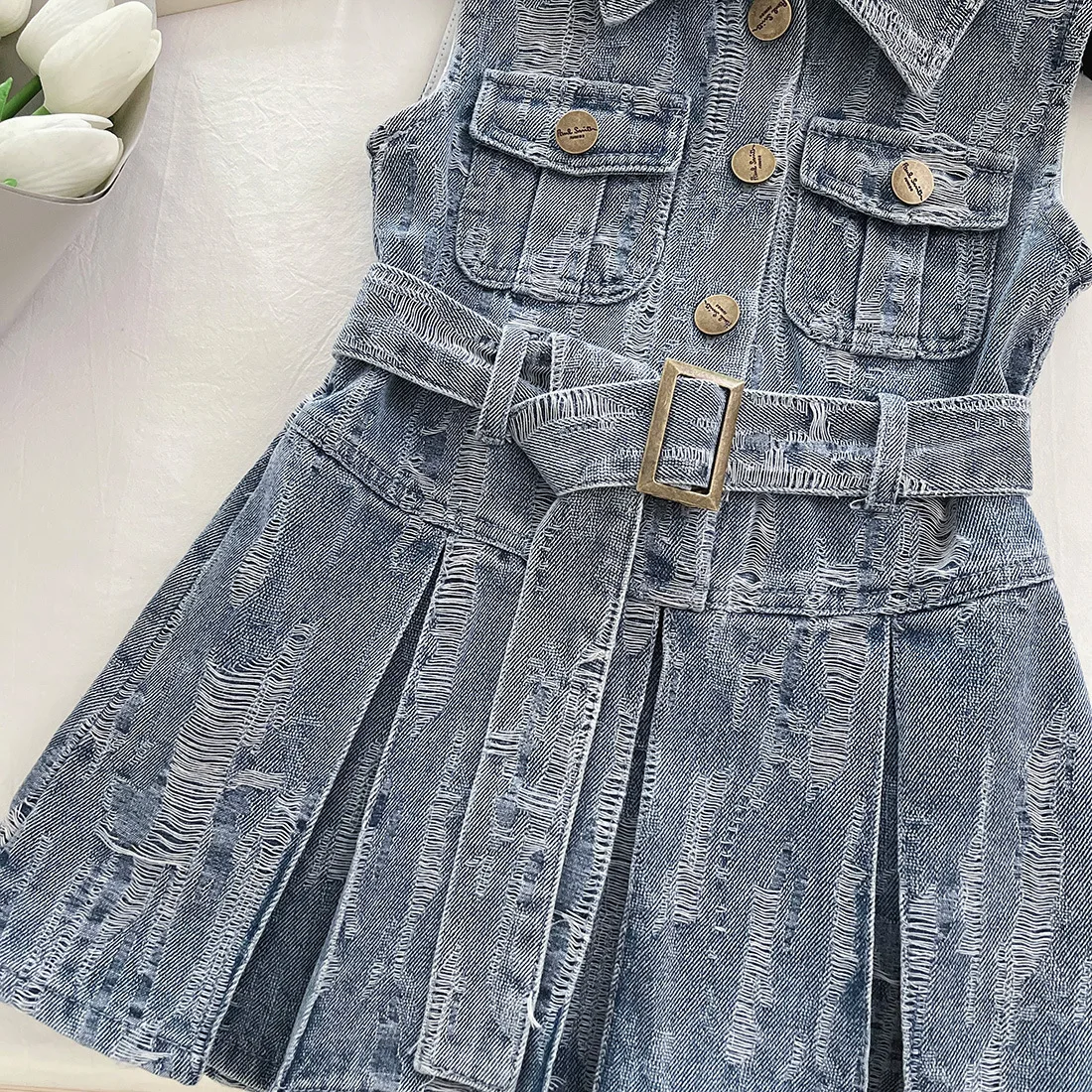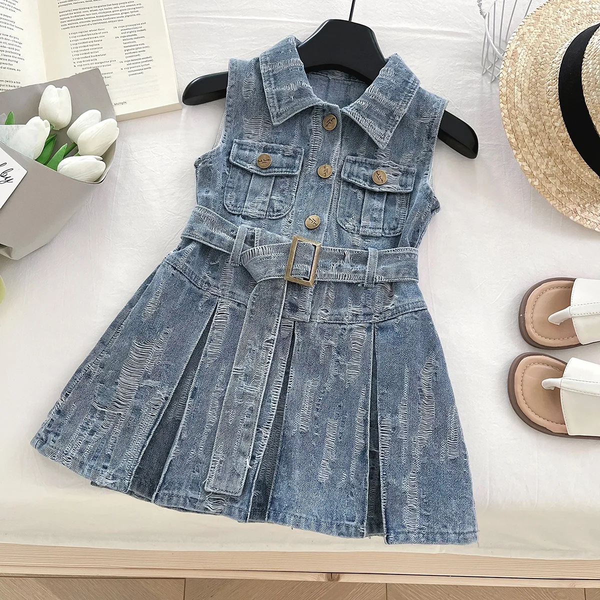 2026 Summer Korean Girls Outfit Turn Down Collar Children Casual Dresses Sleeveless Button Ruffled Denim Dress for Kids